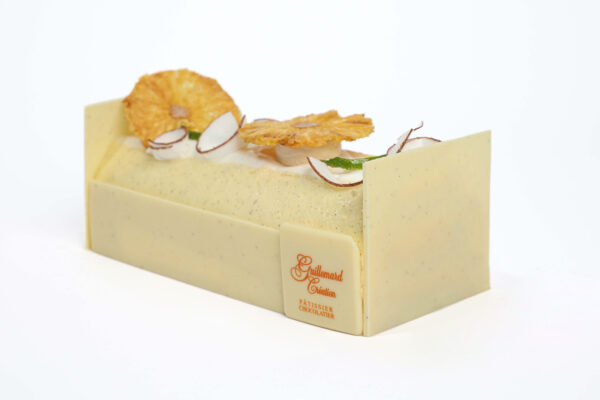 Pour vos repas de fin d’année, laissez-vous transporter par notre Bûche pâtissière Titouan Ananas Coco SANS GLUTEN. Une création signée Guillemard Création qui marie subtilement exotisme et raffinement. Ce dessert festif allie textures variées et saveurs envoûtantes, pour un voyage gourmand qui ravira toutes les papilles.