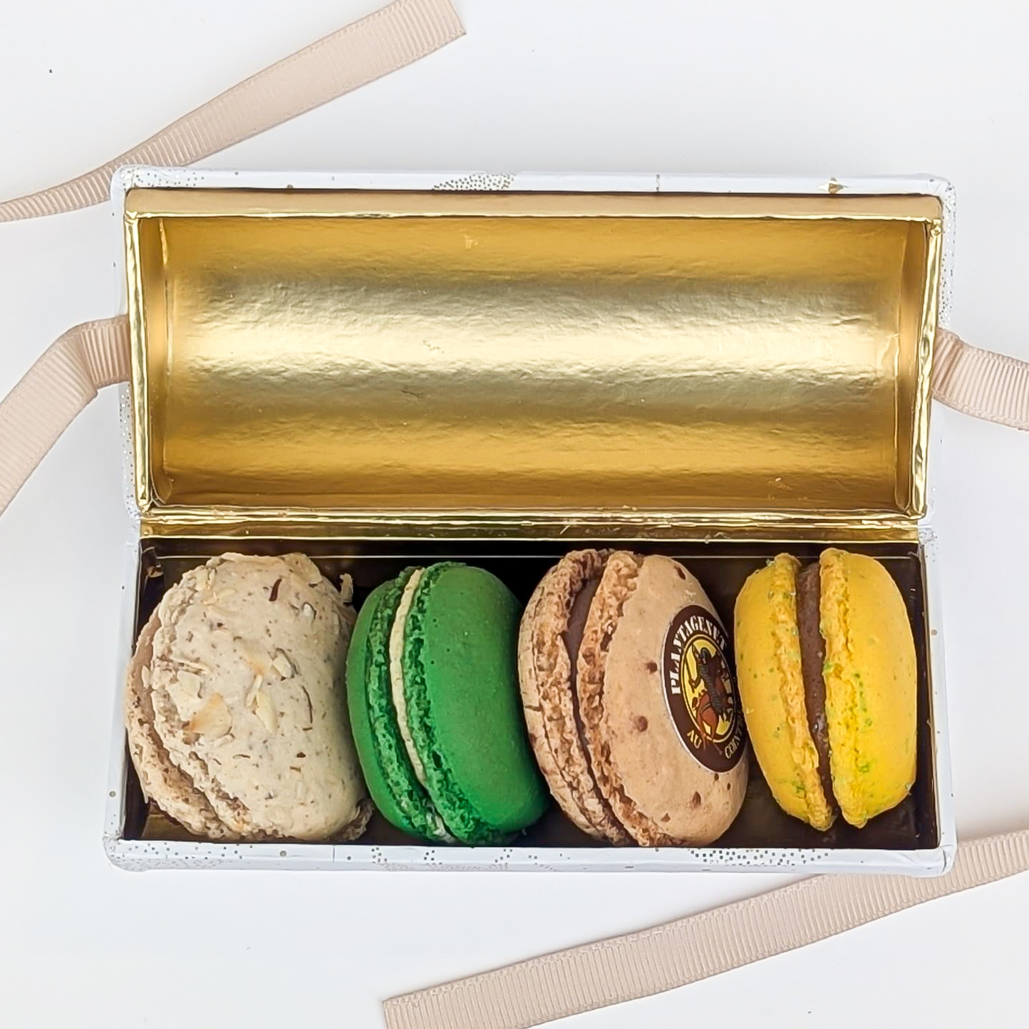 Plongez dans la magie des fêtes avec notre nouveau Coffret Blanc et Doré de Noël. Un écrin élégant et festif renfermant 4 macarons faits maison. Imaginé pour célébrer la gourmandise et l’artisanat. Ce coffret est le cadeau idéal pour illuminer les papilles en cette fin d’année.