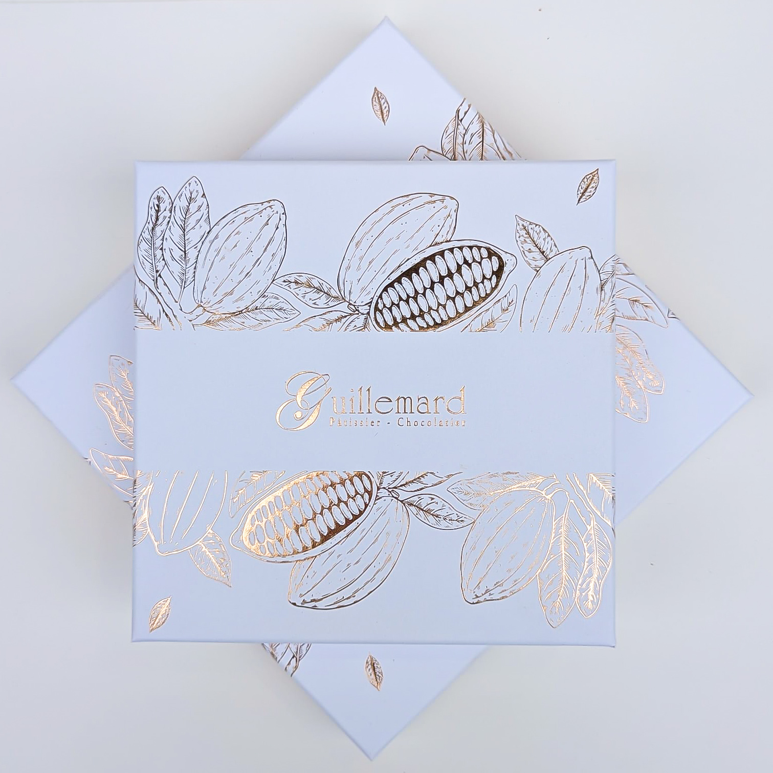 Laissez-vous tenter par ce coffret de chocolats cabosses carré blanc et or raffiné, symbole de notre savoir-faire artisanal et de la magie gourmande des fêtes de fin d’année.