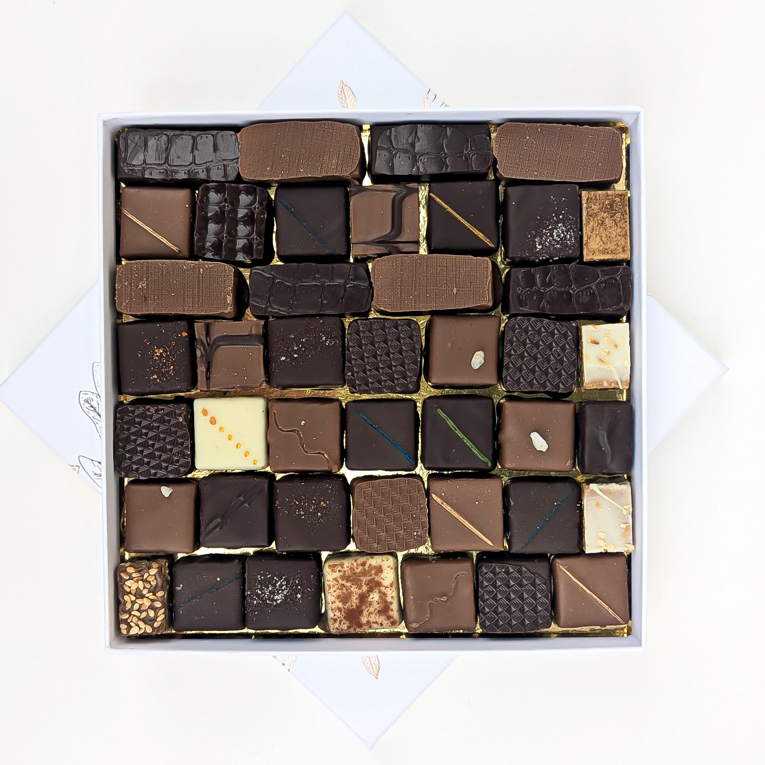 À l’intérieur, découvrez un assortiment harmonieux. Ganaches et pralinés, soigneusement choisis pour leur équilibre et leur intensité aromatique. Enrobés de chocolat noir, lait ou blanc. Nos chocolats offrent une variété de textures et de saveurs : douceur, croquant, onctuosité et notes gourmandes qui raviront tous les amateurs de chocolat.