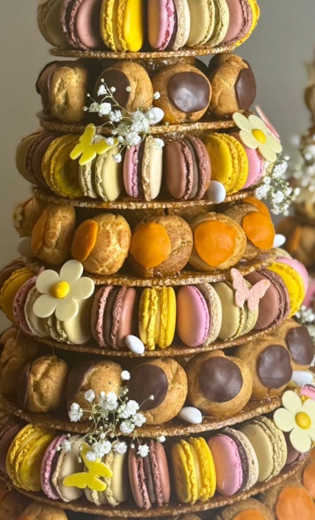 Découvrez notre pièce montée en forme de pyramide, une création sur mesure idéale pour les mariages, anniversaires et événements spéciaux. Chaque rangée est garnie de mignardises, macarons et choux, selon vos préférences, classiques ou originales, pour offrir à vos invités une expérience gourmande unique.