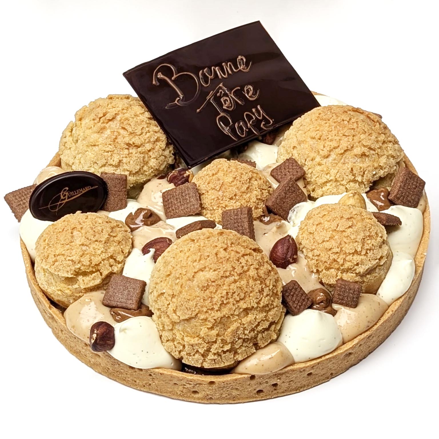 Notre gâteau Tarte gourmande namélaka se compose d’ une pâte sucrée croustillante, un praliné aux éclats de nougatine, des choux garnis de crème namelaka praliné, des choux garnis de crème namelaka vanille, une crème namelaka vanille, une crème namelaka praliné, des noisettes croquantes et de délicieux cubes sablés chocolat.