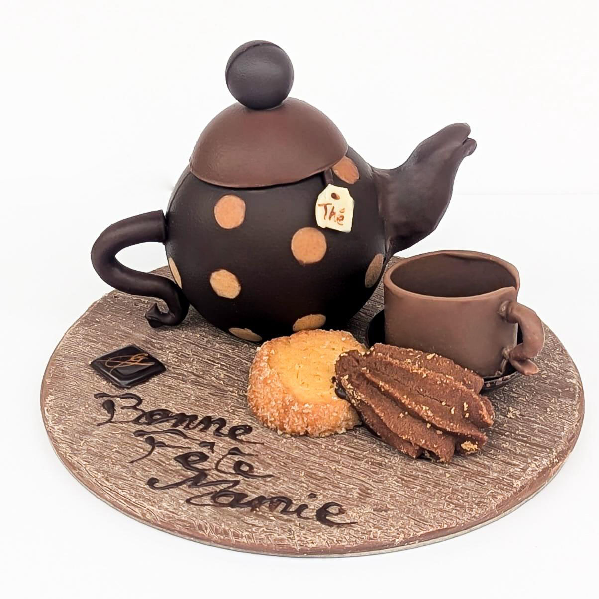 Pour la Fête des Grands-Mères qui approche, nous avons imaginé une création unique et pleine de tendresse. Nos chocolatiers ont réalisé cette théière entièrement à la main dans notre laboratoire chocolat. Ils ont travaillé chaque détail avec précision pour créer une pièce aussi élégante que gourmande.